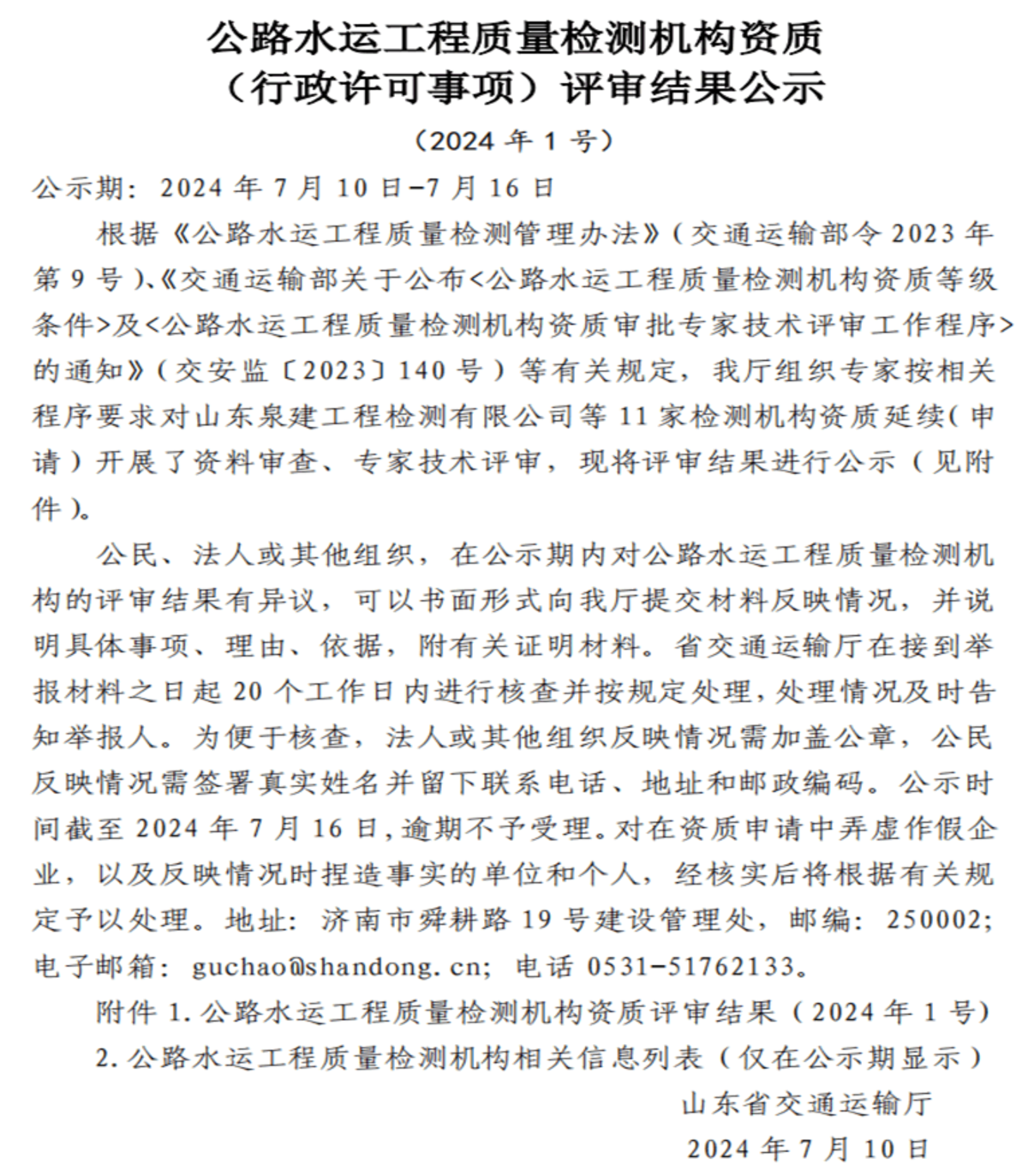 近期,山东省交通运输厅工程建设事务中心组织专家组依据《检测和校准实验室能力的通用要求》(gb/t 27025-2019)、《检验检测机构资质认定能力评价 检验检测机构通用要求》(rb/t214-2017)对我公司进行综合乙级资质延续审批现场评审,由济宁市交通运输综合执法支队进行跟踪监督,顺利通过综合乙级资质延续现场评审并取得证书。