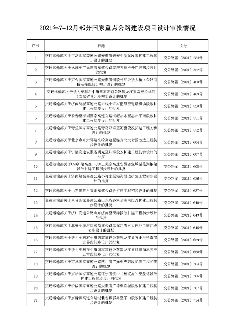 2021年7~12月部分国家重点公路建设项目设计审批情况 -云顶集团官方网站入口