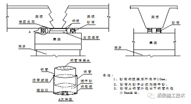 本工程箱梁均为先简后连续箱梁,箱梁安装时均需安放在临时支座上,待墩顶连续张拉,压浆强度达到设计强度后,拆除临时支座,使连续箱梁支承在永久支座上,临时支座采用砂筒,砂筒如图4-3-2-3所示。