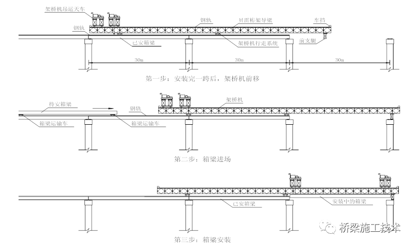 ②箱梁的安装顺序为:先两边,后中间,即应先安装架桥机跨以外的两边箱梁,再安装跨内不需墩顶横移安装的中间部分箱梁。