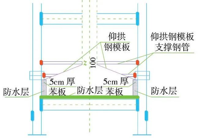 在拱部混凝土施工范围铺设防水层,为确保与中导洞防水的搭接,利用两层5cm厚苯板对防水层进行保护,在中导洞初期支护破除后去除苯板,实现与出入场线防水层的顺接,同时防水层隧道外侧防水层伸出模板超过20cm,便于下步拱墙防水层施工时进行搭接(图11)。