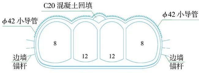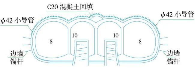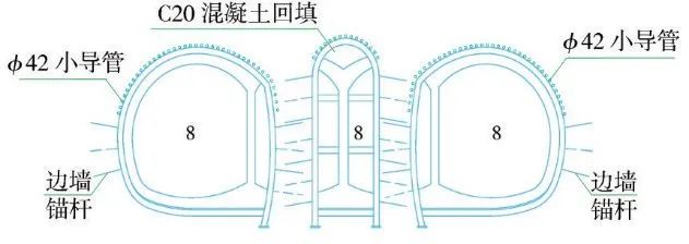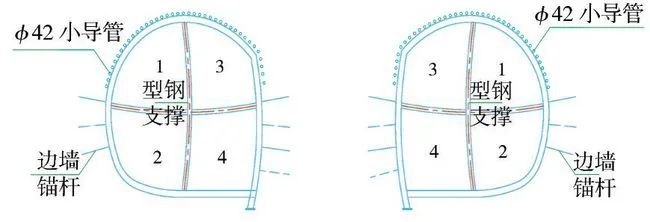 (4)第四步:在完成上述二次衬砌作业后,开始开挖介于上述3个导坑之间的尚未开挖的左右两部分土体。总体上采用从上到下的步序,首先开挖左上、右上两个导坑,同时施做型钢 挂网 锚喷初期支护,施工前先进行拱部ϕ42小导管注浆超前支护(图4)。