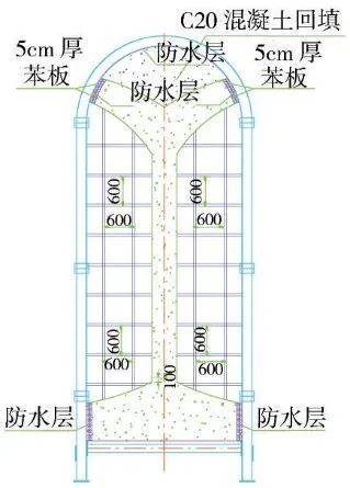 (3)第三步:在上述开挖完成的3个导坑内施做二次衬砌,施工顺序为:铺挂防水层—细石混凝土保护层—二次衬砌钢筋施工—二次衬砌混凝土施工,中导洞二次衬砌施工完毕后在其拱部回填c20混凝土(图3)。