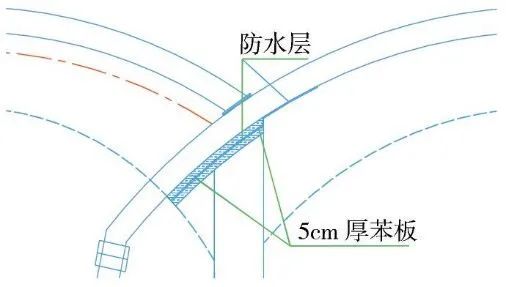 为确保与中导洞防水与出入场线防水的搭接,利用两层5cm厚苯板对防水层进行保护,在中导洞初期支护破除后去除苯板,实现与出入场线防水层的顺接。
