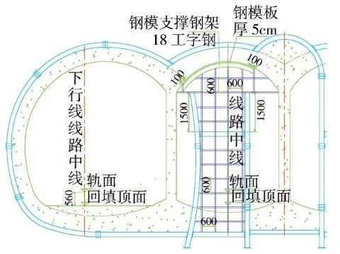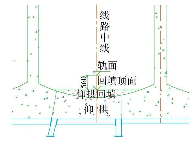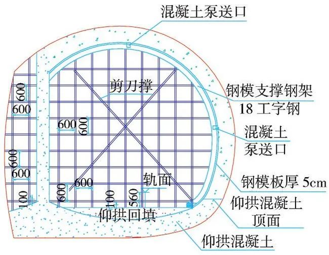 根据设计,轨面以下56cm采用c20混凝土进行回填,为便于拱墙衬砌支架搭设,在仰拱混凝土强度达到2.5mpa时进行仰拱回填施工,回填混凝土具备强度后在回填顶面加设工字钢或钢板,使竖撑和回填混凝土紧密接触,确保初期支护稳定(图10)。
