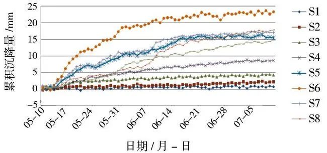 为了掌握围岩的稳定性和支护结构的受力状态,分析区域性施工特征,及时发现不稳定因素,验证设计并指导施工,必须加强施工监测。监测的重点主要为地表沉降、拱顶下沉以及洞身收敛,其次为结构及围岩应力的测量。由于四联拱隧道施工共进行17次分步开挖,对土体产生多次扰动和累计沉降,因此地表沉降量的监测和控制是控制施工安全的最核心内容和最关键的重要措施。因篇幅所限,仅对地表沉降过程和结果作简要叙述。