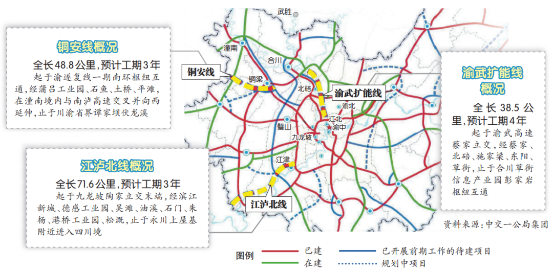 该项目于2020年8月正式开工,预计工期4年,预计2025年建成通车。建成后将有效缓解既有渝武高速拥堵,助推成渝地区交通一体化。由中交联合体和重庆高速集团共同投资、建设、运营,实施全生命周期管理,建设期4年。