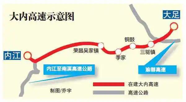 重庆段于2019年7月正式动工,四川段于2021年初动工,预计在2023年建成并投入使用。据悉,该高速公路全线建成通车后,重庆大足至四川内江驾车只需1小时左右。该项目由中国铁建昆仑投资集团、中铁十七局等单位投资建设。