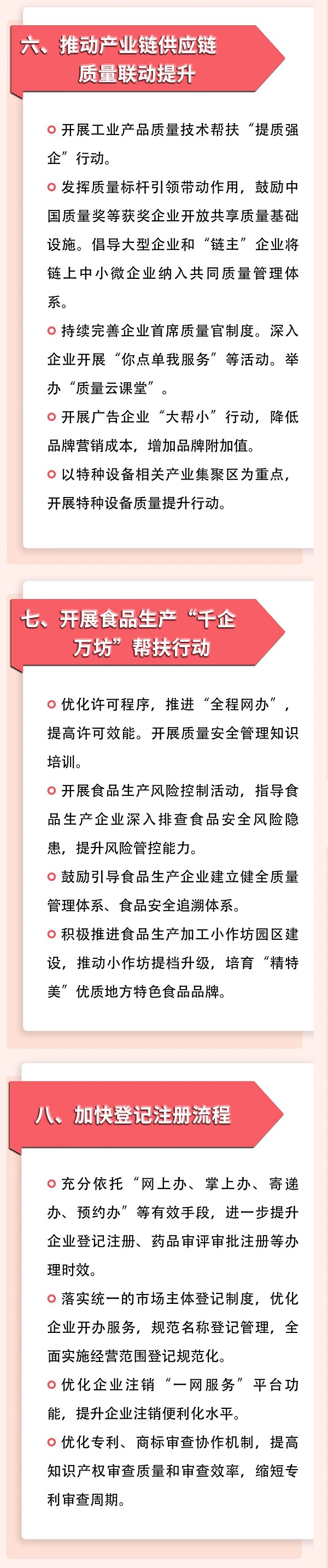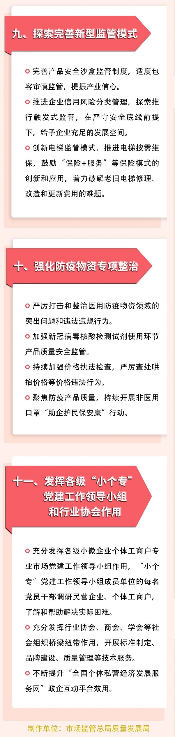 《通知》明确了四个方面11项重点任务。要求深化质量基础设施“一站式”服务“惠百城助万企”活动,深入开展“计量服务中小企业行”活动,提升标准化服务水平,开展小微企业质量管理体系认证升级,优化检验检测技术服务。围绕推动产业链供应链质量联动提升,开展工业产品质量技术帮扶“提质强企”行动,推动先进质量理念、质量管理模式向产业链两端延伸,持续完善企业首席质量官制度,开展广告企业“大帮小”行动、特种设备质量提升行动、食品生产“千企万坊”帮扶行动。探索完善新型监管模式,完善产品安全沙盒监管制度,针对新产品新技术新模式适度包容审慎监管。推进企业信用风险分类管理,探索推行触发式监管。严厉打击和整治医用防疫物资领域的突出问题和违法违规行为,持续加强价格执法检查。提升企业登记注册、药品审评审批注册等办理时效,提高知识产权审查质量和审查效率,充分发挥各级小微企业、个体工商户、专业市场党建工作领导小组作用,了解和帮助解决实际困难。