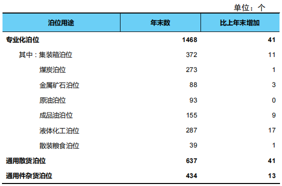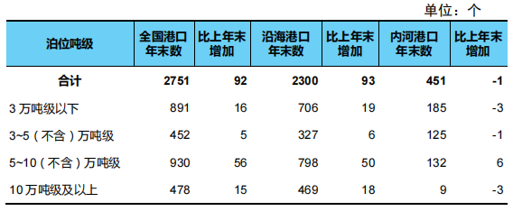 年末全国港口万吨级及以上泊位2751个,比上年末增加92个。从分布结构看,沿海港口万吨级及以上泊位2300个、增加93个,内河港口万吨级及以上泊位451个、减少1个。从用途结构看,专业化万吨级及以上泊位1468个、增加41个,通用散货万吨级及以上泊位637个、增加41个,通用件杂货泊位434个、增加13个。