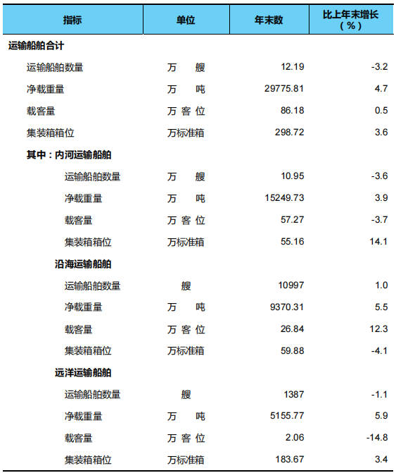 年末全国拥有水上运输船舶12.19万艘,比上年末减少0.40万艘,净载重量2.98亿吨、增加0.13亿吨,载客量86.18万客位、增加0.40万客位,集装箱箱位298.72万标准箱、增加10.29万标准箱。