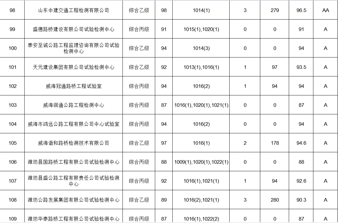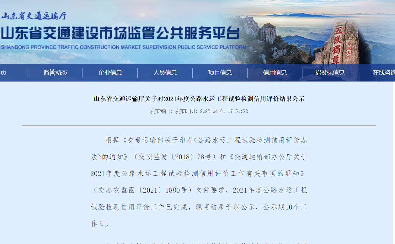 近日山东省交通运输厅发布《山东省交通运输厅关于2021年度公路水运工程试验检测信用评价结果公示》,山东中建交通工程检测有限公司获评2021年度山东省公路水运工程试验检测信用评价最高等级aa级。