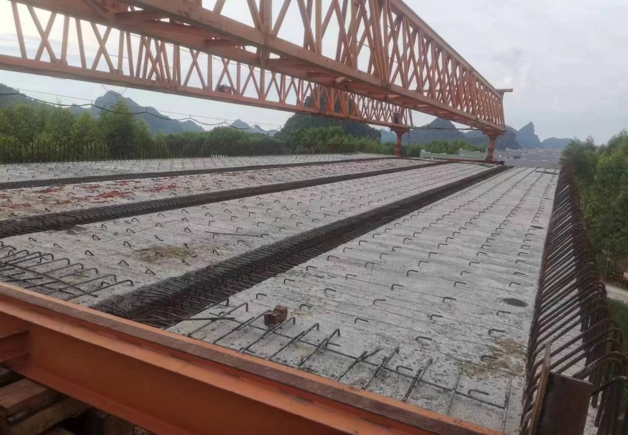 上跨南广高铁特大桥引桥全长1600.27米,为贵港西外环高速公路项目姚山互通控制性节点工程,也是贵港西外环高速公路衔接贵隆高速的重要通道。全桥预制箱梁共计379片,后续箱梁架设施工正紧张有序组织中。