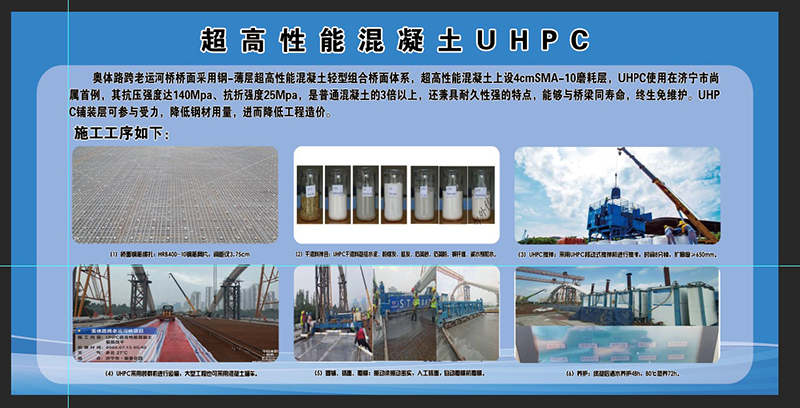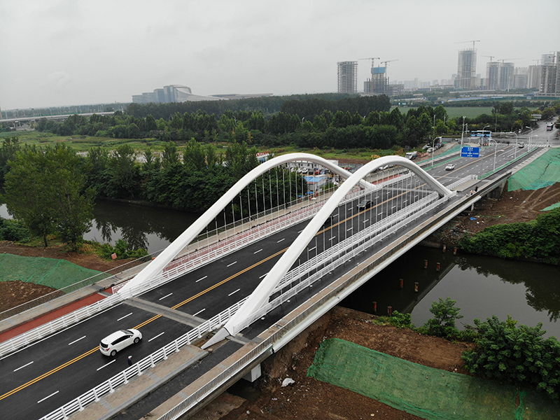 奥体路跨老运河桥主桥采用 74m 下承式钢结构拱桥,桥面采用钢-薄层超高性能混凝土轻型组合桥面体系,在济宁桥梁建设中属于首例。施工中还采用了钢结构高效焊接技术、高强钢筋应用技术、高强钢筋直螺纹连接技术、预应力技术、索结构应用技术、施工扬尘控制技术、透水混凝土技术等国家推荐的十项新技术。