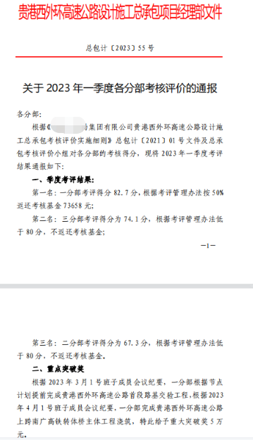好的过程带来好的结果。近日,贵港西外环项目部收到总包单位考核评价通报文件,我项目部在一季度考评评比中获得第一名佳绩,并获得考核基金7.36万元及重大突破奖金5万元。