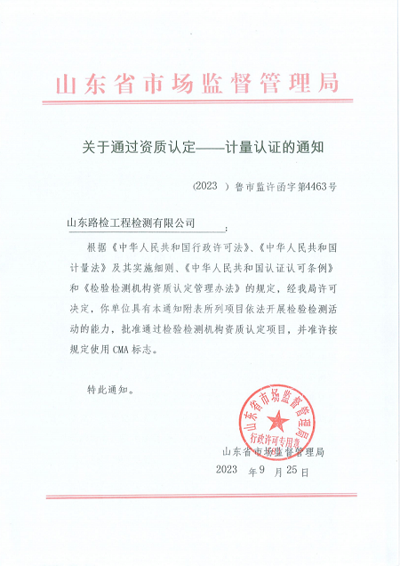 近期,山东省检验检测机构资质认定主管部门对山东路检检测公司进行资质认定换证复核现场评审,山东路检检测公司顺利通过资质认定换证复核现场评审并取得证书。